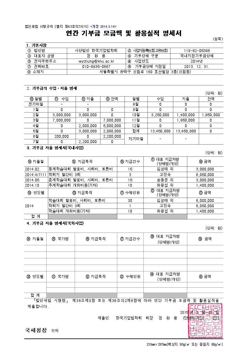 2014년 연간 기부금 모금액 및 활용실적 명세서