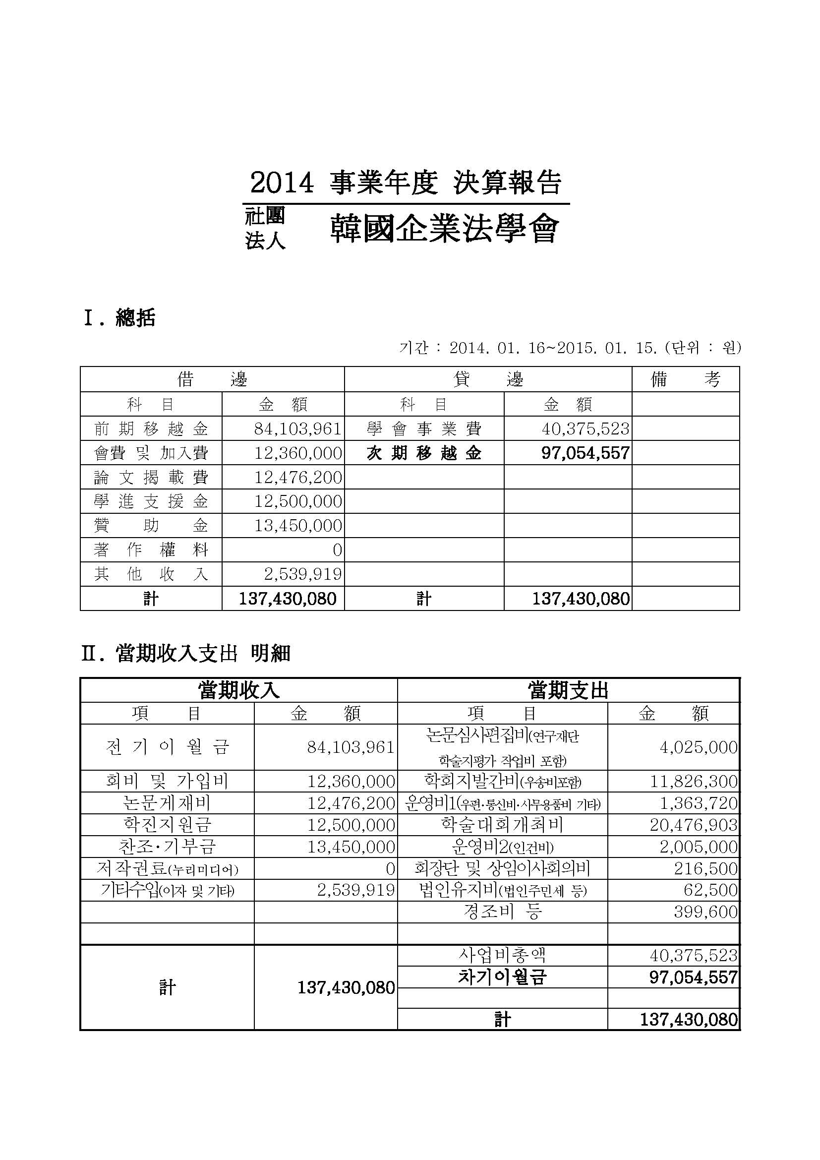 2014년 연간 기부금 모금액 및 활용실적 명세서