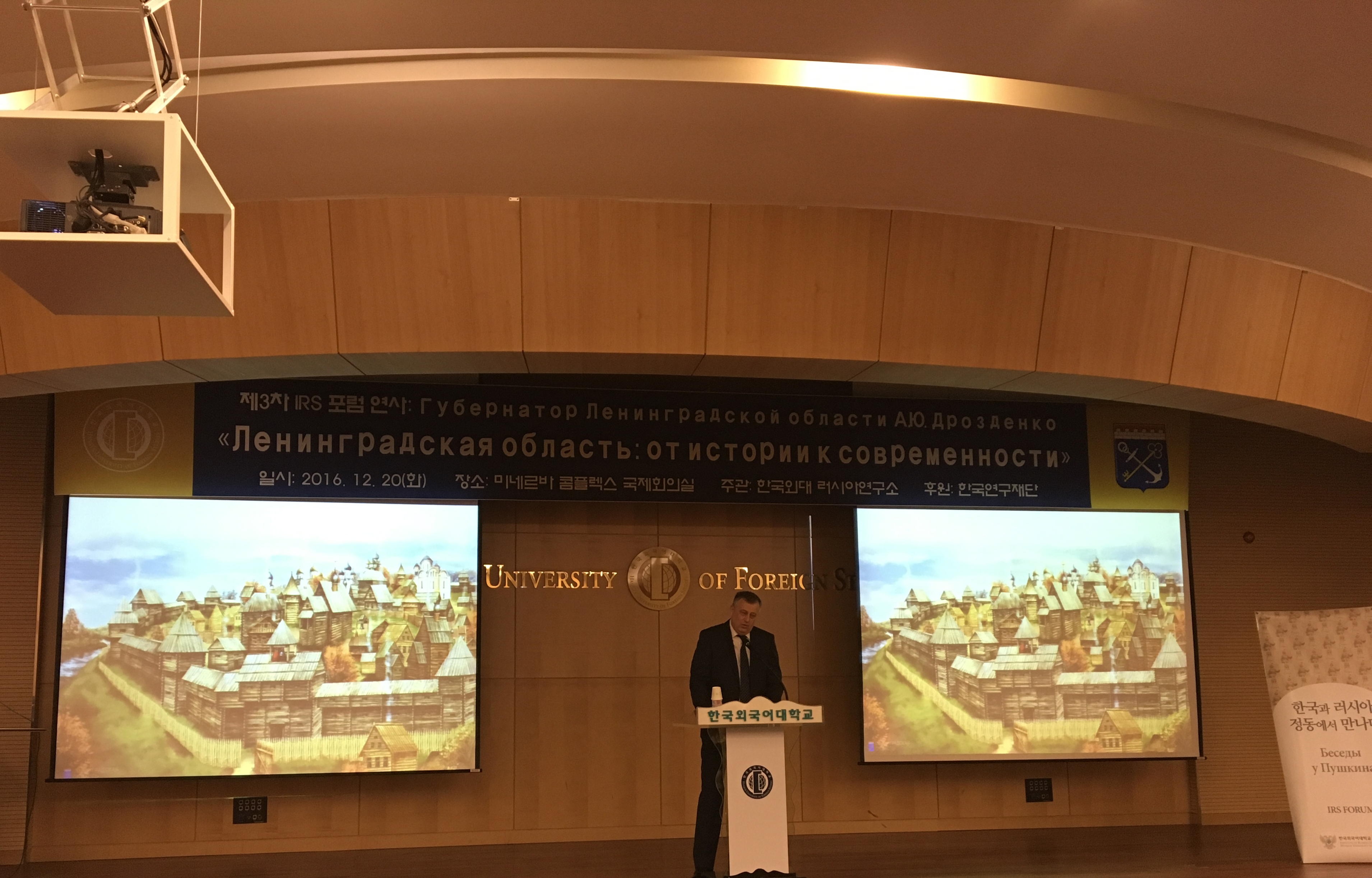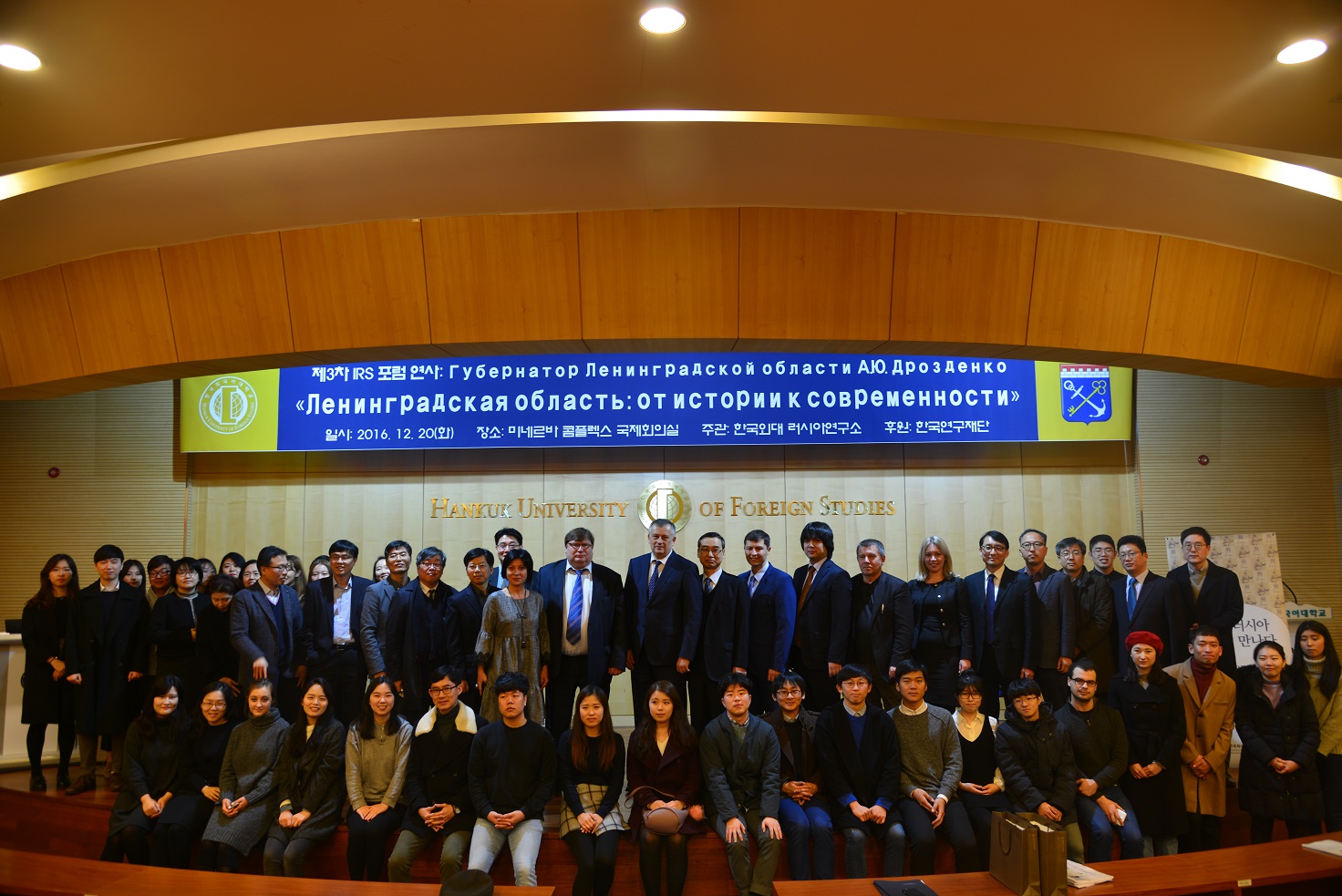 러시아연구소는 2016년 12월 20일(화) 이문동 캠퍼스에서 제3차 IRS FORUM을 개최했다. 이번 포럼에서는 알렉산드르 드로젠코 러시아 레닌그라드 주지사가 “레닌그라드 주의 역사와 현대성”이라는 주제로 발표했다. 알렉산드르 드로젠코는 고대 도시 스타라야 라도가(Старая Ладога)부터 갓치나(Гатчина), 비보르크(Выборг)까지 레닌그라드 주의 역사적인 지역뿐만 아니라 오늘날 새로운 경제적 거점도시를 소개하며 이 지역의 역사와 역동적으로 변모하는 모습을 설명했다. 이번 포럼에는 방학을 맞이했음에도 많은 학생들이 참석했으며, 학생들의 다양한 질문으로 레닌그라드 주의 정치, 경제적 측면을 더욱 심층적으로 알아볼 수 있었다.