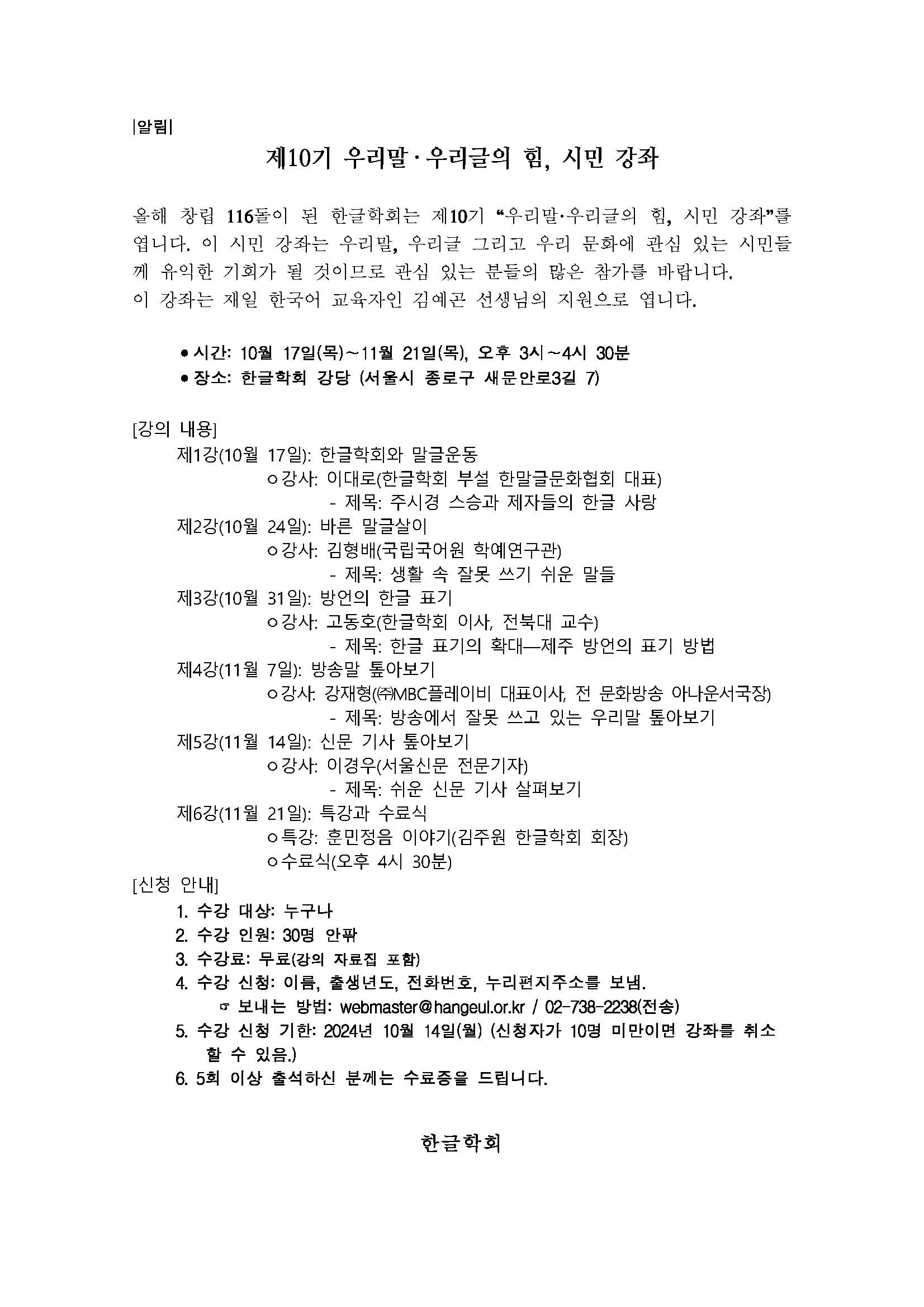 제10기 우리말·우리글의 힘, 시민 강좌를 엽니다.