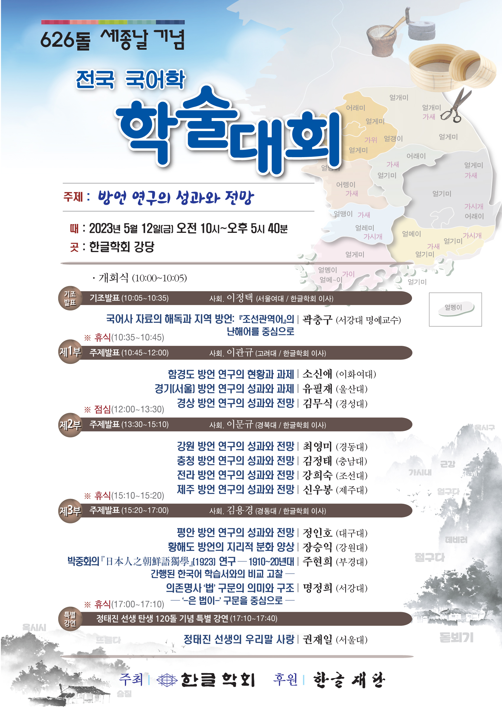 “방언 연구의 성과와 전망”을 주제로 한 이번 학술대회에서는 남북한 전역의 방언에 관한 연구 성과를 살펴보고 앞으로의 과제를 논의해 보고자 합니다. 아울러 조선어학회 선열인 정태진 선생 탄생 120돌 기념 특별 강연도 함께 준비하였습니다. 뜻깊은 학술마당에 회원 여러분의 많은 관심과 성원을 부탁드립니다.