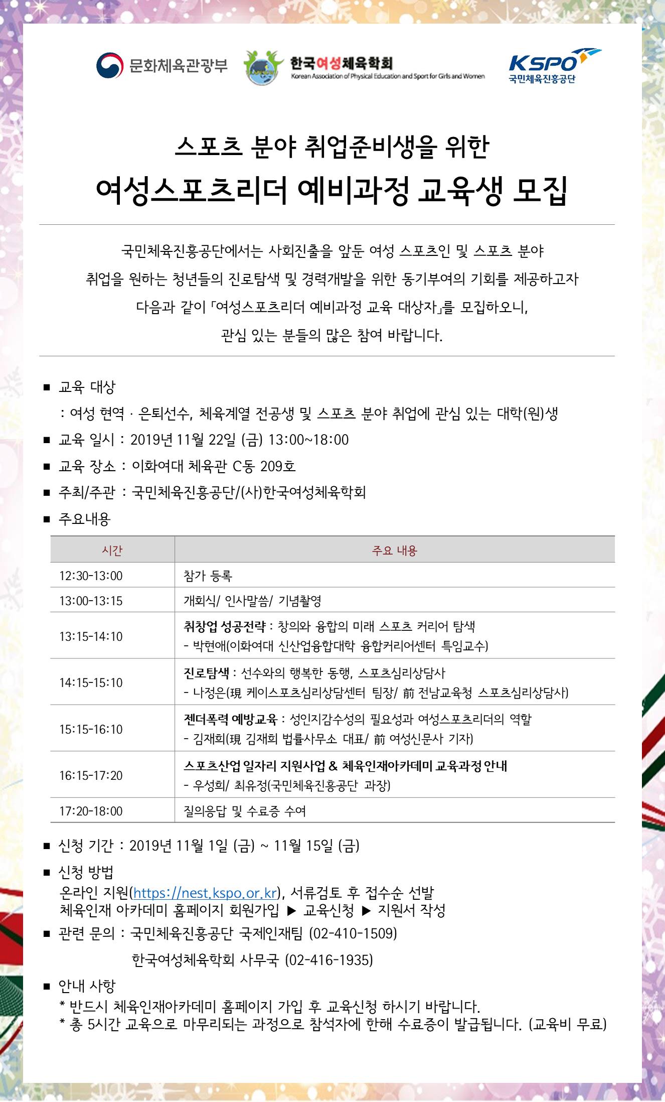 [국민체육진흥공단/한국여성체육학회] 여성스포츠리더 예비과정 교육생 모집 안내