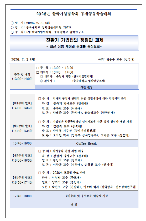 2026년도 동계학술대회 개최 안내드립니다.○ 주제 : 전환기 기업법의 쟁점과 과제 : 최근 상법 개정과 판례를 중심으로